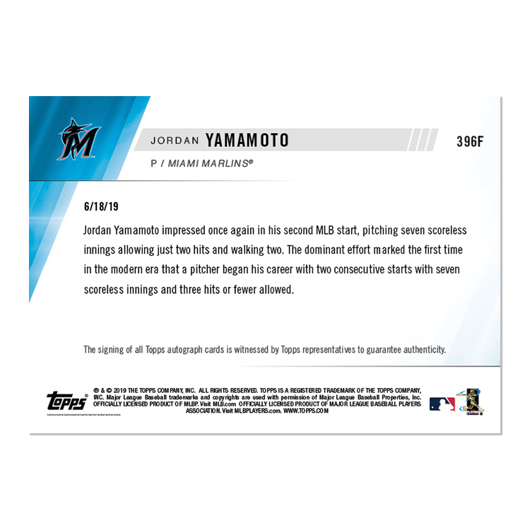 On-Card Auto # to 1 - Jordan Yamamoto - MLB TOPPS NOW® Card 396F