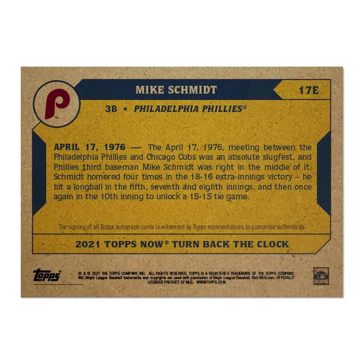 On-Card Auto # to 1 - Mike Schmidt - 2021 MLB TOPPS NOW® Turn Back The Clock - Card 17E