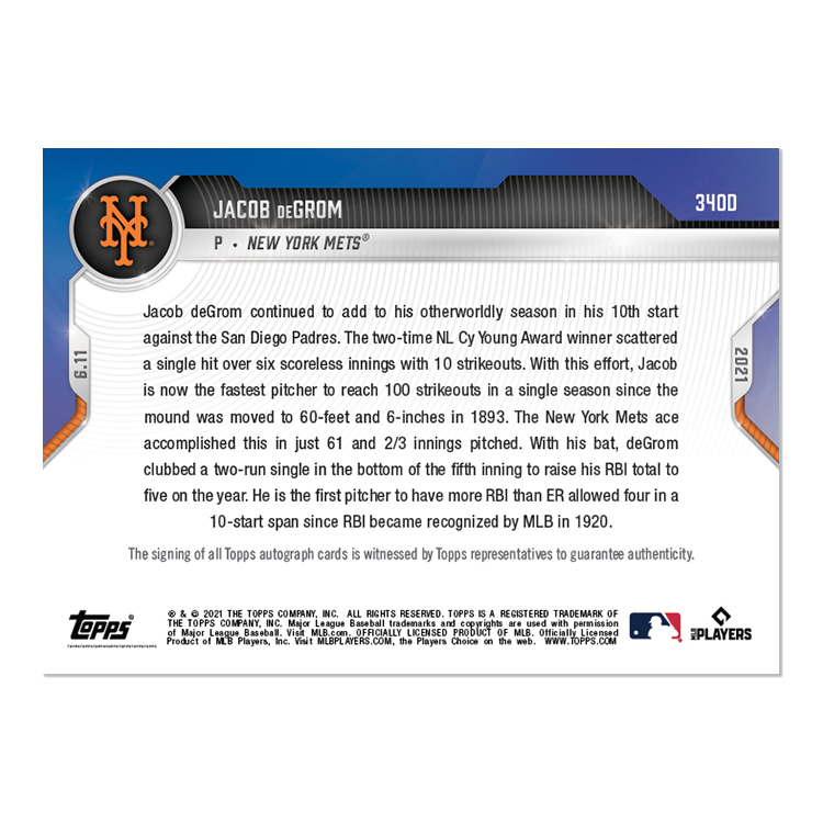 On-Card Auto # to 10 - Jacob deGrom - 2021 MLB TOPPS NOW® Card 340D