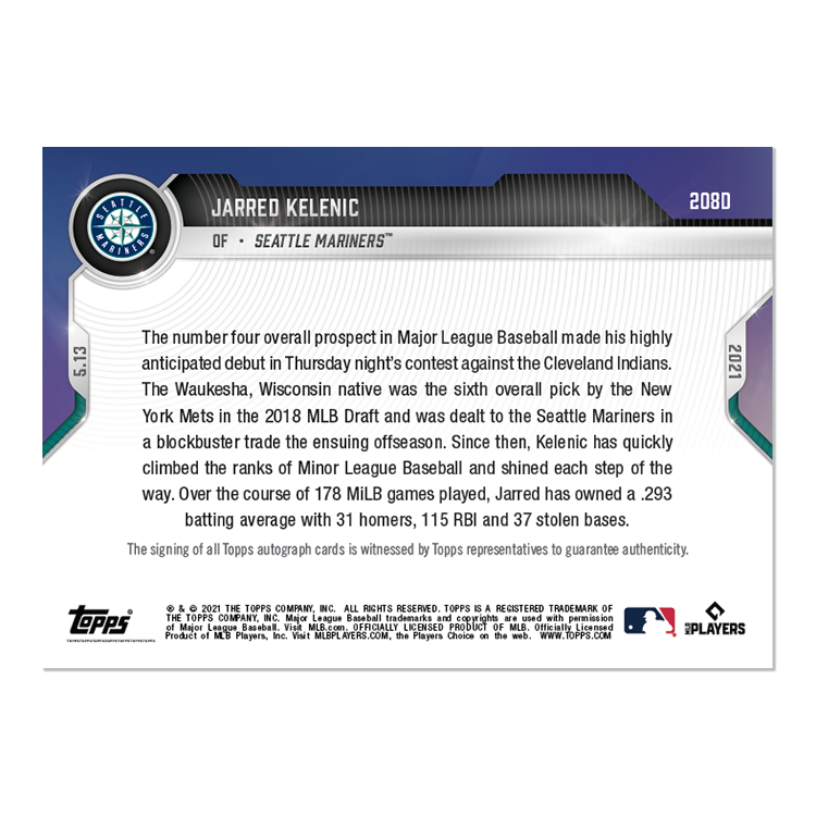 On-Card Auto # to 10 - Jarred Kelenic - 2021 MLB TOPPS NOW® Card 208D