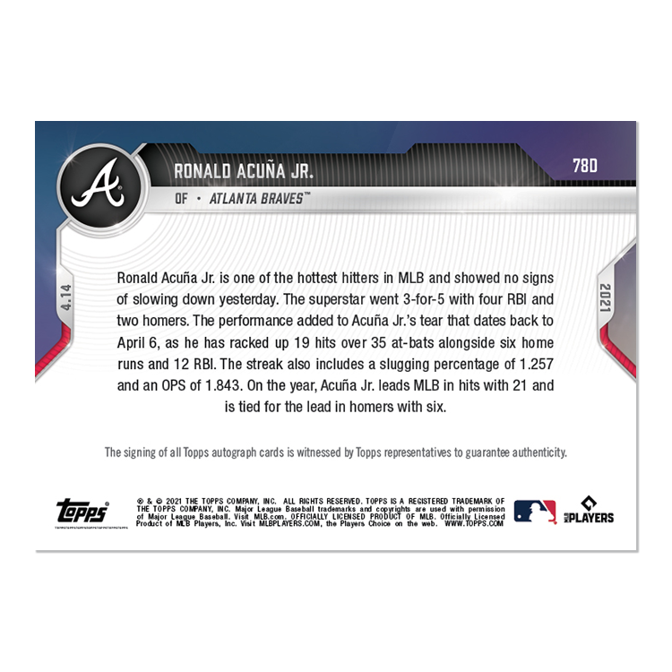 On-Card Auto # to 10 - Ronald Acuña Jr. - 2021 MLB TOPPS NOW® Card 78D