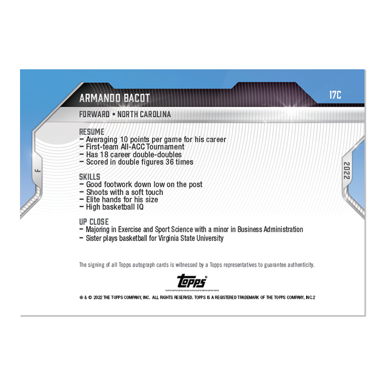 On-Card Auto # to 25 - Armando Bacot - 2022 Bowman NEXT TOPPS NOW® Basketball Card 17C