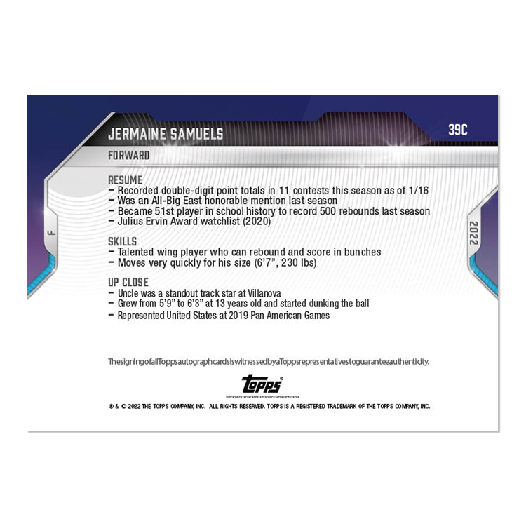 On-Card Auto # to 25 - Jermaine Samuels - 2022 Bowman NEXT TOPPS NOW® Basketball Card 39C