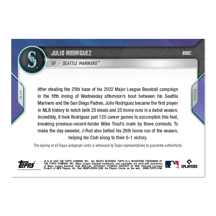 On-Card Auto # to 25 - Julio Rodriguez - 2022 MLB TOPPS NOW® Card 899C