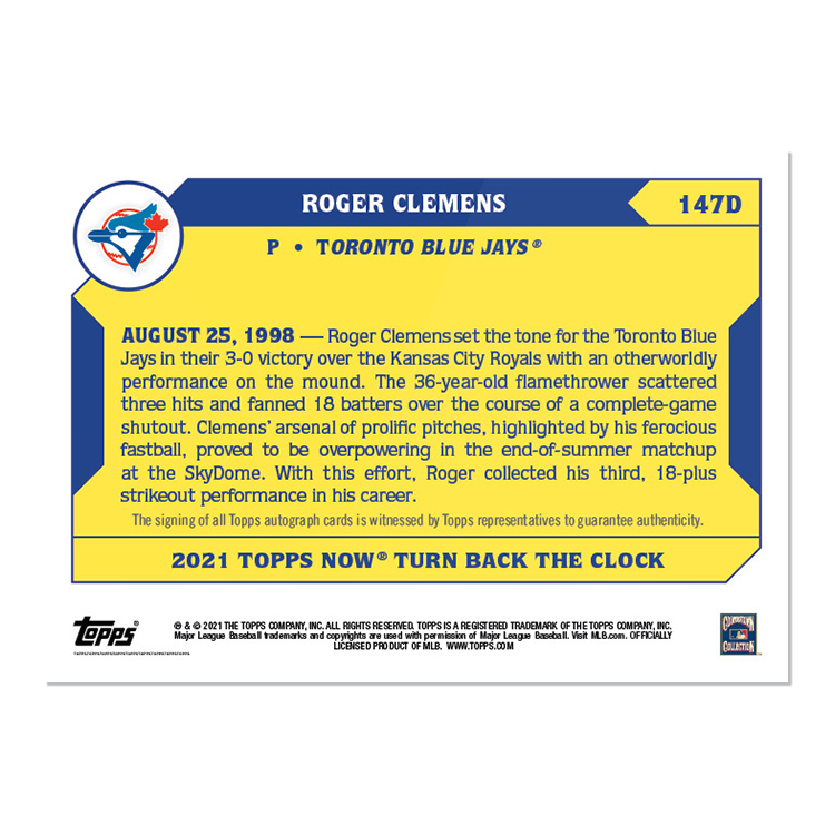On-Card Auto # to 5 - Roger Clemens - 2021 MLB TOPPS NOW® Turn Back The Clock - Card 147D