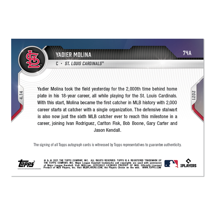 On-Card Auto # to 99 - Yadier Molina - 2021 MLB TOPPS NOW® Card 74A